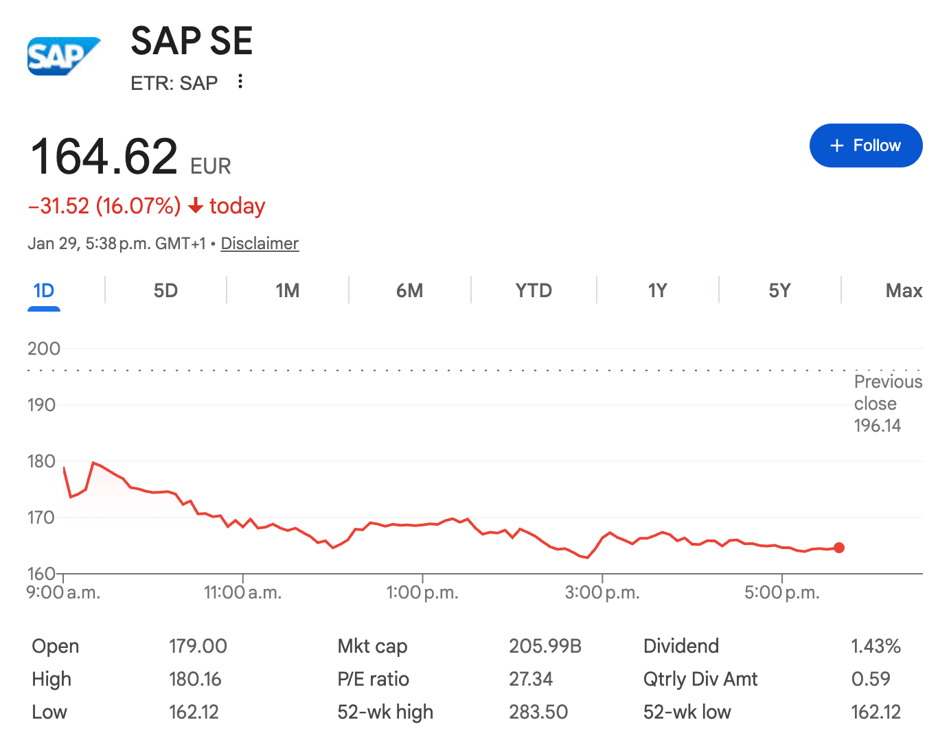The contagion spread fast. Software stocks got absolutely obliterated on fears that AI will cannibalize their business models. The $IGV ETF (software sector tracker) crashed 5%—its worst day since last April. German software giant SAP plunged 16% after reporting weak cloud growth.