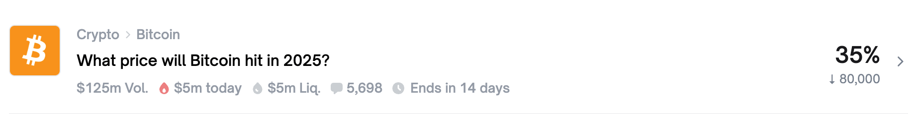 There's currently a 35% chance Bitcoin drops below $80K before year-end. Almost a coin flip.
