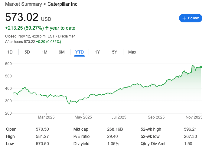 Goldman Sachs, JPMorgan, and American Express — all hitting fresh record highs. Even Caterpillar flexed, up 1% and a ridiculous 60% YTD.