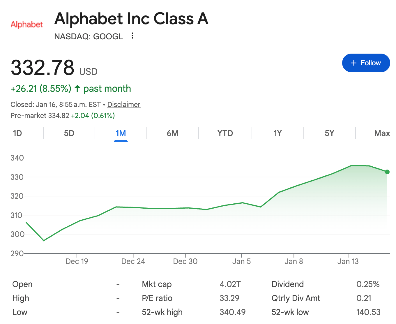 Today? Google's sitting at $332. Up 5.7% in two weeks.