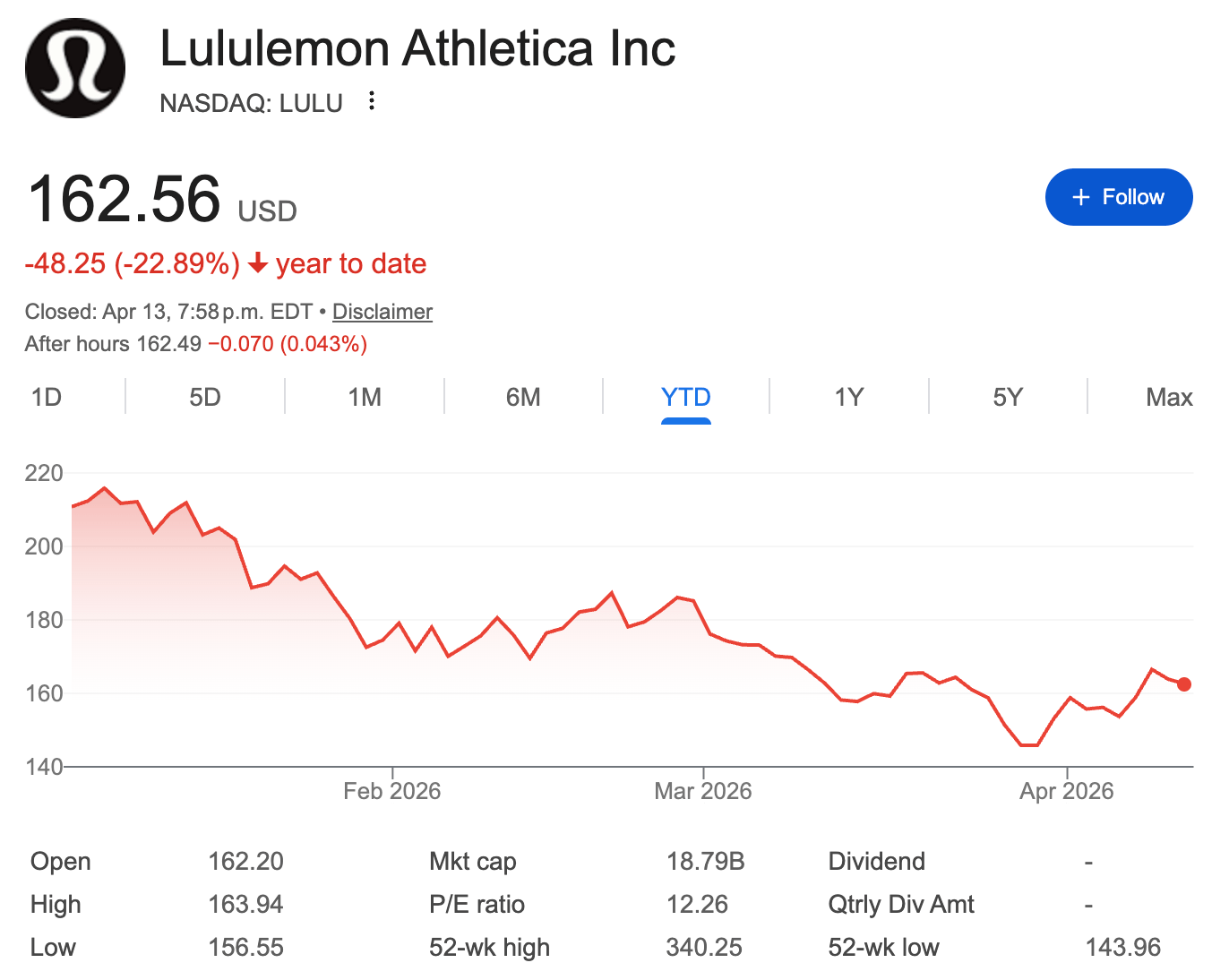 The stock is already a disaster. Down 48% over the past year. 52-week high of $340.25. Trading today around $164. The guy who actually founded Lululemon, Chip Wilson, is currently in a public fight with the company's board over how it's being run. Oh, and the CEO chair is empty.