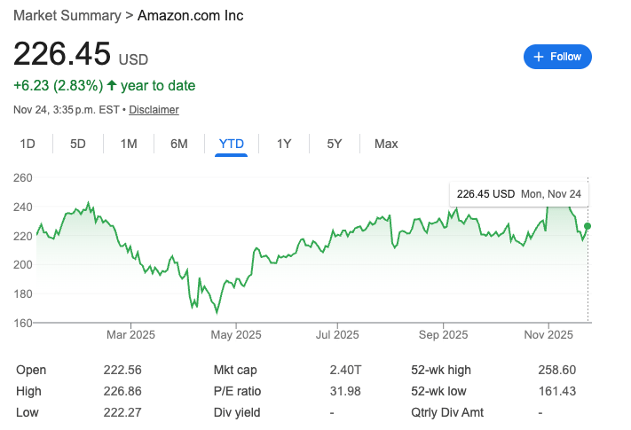 When a mega-cap spends $50B on AI for the government, you don’t fade it. But Amazon’s stock has had a rough year, up less than 3% so while the headline is nice, deeper stuff is brewing below the surface.